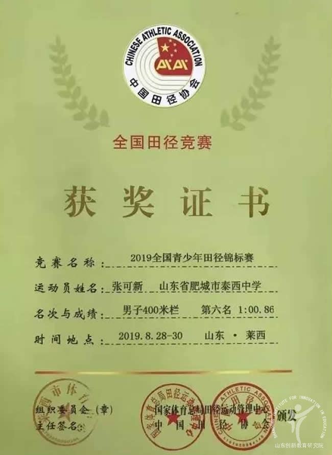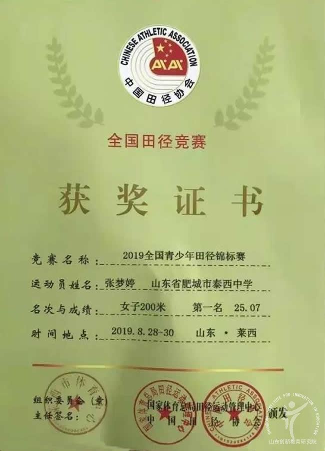 “康比特杯”2019年全国青少年田径锦标赛近日在青岛市体育中心举办。泰西中学代表队10名运动员由张勇、刘强两位老师带队参赛,经过激烈的角逐,凭借过硬的本领与高昂的斗志,张梦婷勇夺女子100米第一名(成绩12″16)、女子200米第一名(成绩25″07)。张可新勇夺男子400米栏第六名(成绩1′00″08),程国睿勇夺男子铁饼第七名(39.33米)。