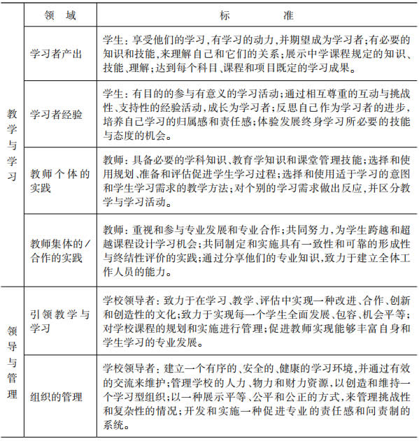 以中学阶段为例,《关注我们的学校2016:中学质量框架》[9]提供了学校工作两大维度的一个统一的和契合的标准,主要关注教学与学习、领导与管理两个维度,抓住了学校工作的两个关键领域(见表1)。每个维度被划分成若干个领域,尽管这些领域是相互关联的,但各领域代表鲜明的特点。然后每个领域被提供了标准,这些标准代表了有效的、运作良好的学校实践的特定行为与属性特征。