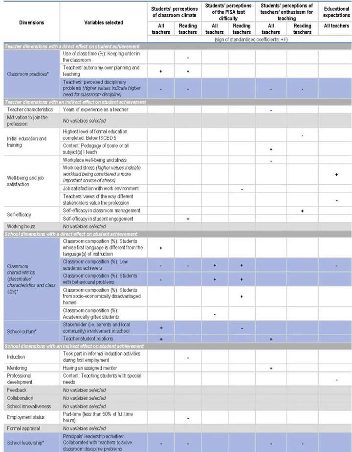 1.教师的课堂实践、教师的幸福感和工作满意度、教师工作时间的使用、班级特点、学校文化和学校领导6个维度与学生的阅读、数学和科学成绩均有显著性相关。其中有三个维度最为重要,且在政策杠杆范围之内。