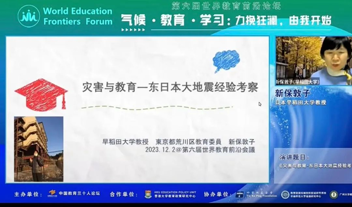大家好,非常荣幸出席第六届世界教育前沿会议,我是新保敦子,日本早稻田大学的教授,作为嘉宾衷心感谢邀请,我演讲的题目是《灾害与教育——东日本大地震经验考察》。
