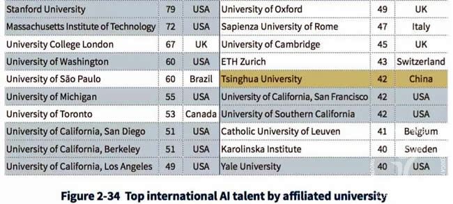 报告也引用了另外一些指标,佐证了这一结论。比如,2018年7月清华大学中国科学技术政策研究中心发布的《中国人工智能发展报告2018》显示,全球拥有顶尖AI人才最多的前20所大学,中国只有清华,排在第15名。