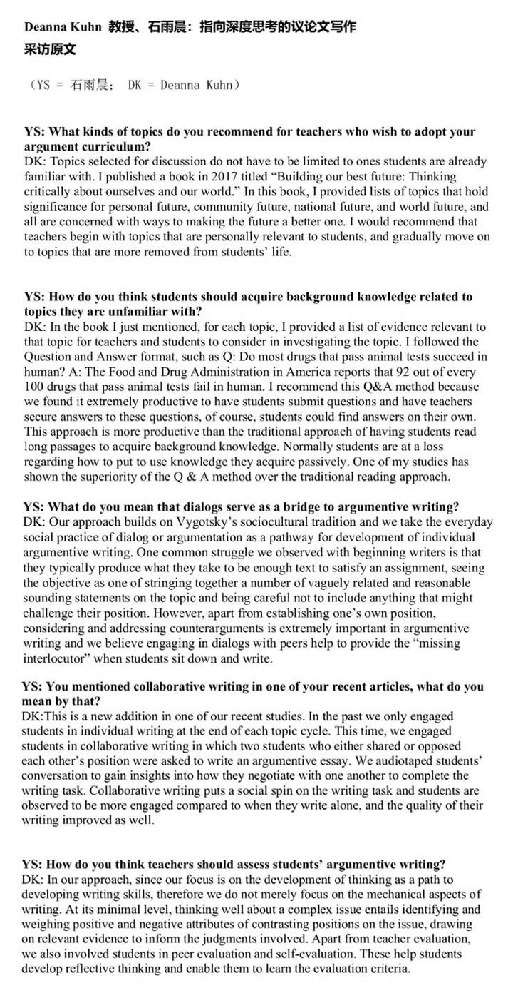 (YS = 石雨晨;DK = Deanna Kuhn,以下内容根据英文内容翻译整理完成。采访原文附文后)