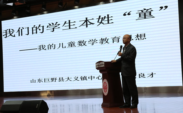 29日上午,在乡村教育家高峰论坛上,山东省巨野县大义镇中心小学的朱良才老师做《我的学生本姓 “童”》的报告。报告中朱老师讲述了自己立足乡村教育改革的故事和自己的教育思想与实践智慧。朱老师提出“我的孩子本姓 “童”的理念,讲述了“童谣、童趣、童话”三童教育创新实践和教育思想。