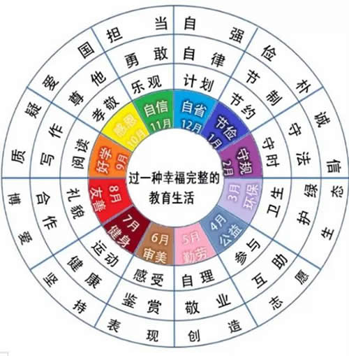 通过“每月一事”的融合,让师生的教育生活从被学科割裂变得完整,践行“每月一事”的过程,本身就是幸福的教育生活。“每月一事”所梳理与提炼出的 12 个习纲,是一个“完整的人”所必须具备的素养,这样“完整的人”也就必然会创造并拥有“完整幸福”的生活。