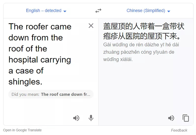 在2019年接受果壳网的采访中,他严厉地批评 AI 领域的机器学习路径。例如,Google 翻译团队宣称他们的翻译水平已经达到了人类水平,但仍然会犯低级错误,如下图所示,在明显的上下文里,将 “shingle” 翻译为 “带状疱疹” 而非 “瓦片”。