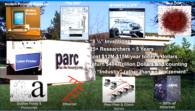 PARC 是 1970 年施乐(Xerox)发起的,致力于为 “未来的办公室” 做长期研究的机构。施乐靠激光打印机成为全球知名的数字与信息技术产品公司,其前身是 ARPA(Advanced Research Projects Agency),互联网的原型阿帕网(APRAnet)就是这个机构在1966年的研究产物。