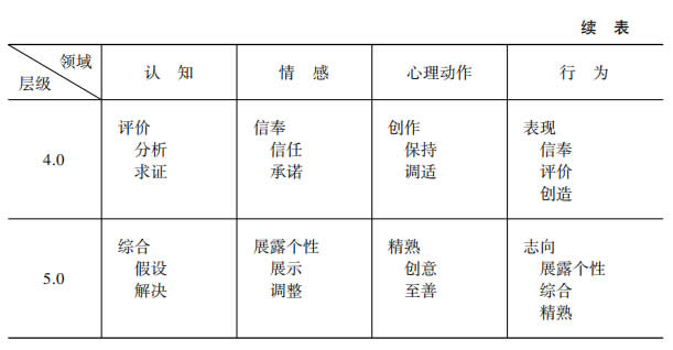 在布卢姆那里,四个层级是具体细分的,而且每个层级内部又划分为不同等级的子类目,由此构成一个以类目为基础的线性的层级化目标。正因为过于细化和强调累积层次结构,受到不同程度的批评,如几位权威人士认为“综合之中孕含着评价,因此它们之间不存在主从关系”“在目标分类中评价不应置于综合之上,而是至多与它平行” [28]。有一些测试与调查也发现“综合”与“评价”的顺序被颠倒了。[29]如果要对此进行质的区分,把综合与评价整合在一起可能会更好一些,强调对知识或材料的判断、排列与组合,形成新的认知。