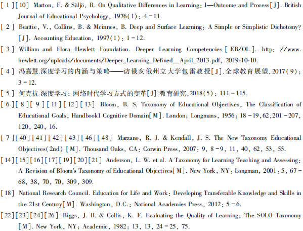 通过对上述三个认知目标分类的梳理与比较,发现每个分类内部均存在不同层级的深度学习目标,如布卢姆的“运用、分析、综合、评价”,安德森修订版的“理解、运用、分析、评价、创造”,以及彼格斯的“关联、抽象扩展”。尽管三者的分类立足点不同,类目表述也不尽相同,但深究其背后的认知观与思维状态,仍有共同之处。一是认知与建构取向。布卢姆认知目标分类学对学习的种类、层次性与累积性以及迁移等假定,显示出与当时占统治地位的行为主义不一样的心理学取向,具有明显的信息加工和认知发展观,正如对布卢姆教育目标分类学40年回顾中的评论那样,“分类学的作者们在他们提出的心理学的预先假定中是多么大胆,在许多方面,又是多么现代。……他们的现代性明显体现在:几十年后他们参与了心理学理论中发生的种种发展”[27]。安德森等人的修订版和彼格斯等人的心理建构倾向就更加鲜明了。二是不同层级类目的本质内涵趋于一致。具体分析这些类目的实际指向,均指向言语思维层次的高级认知活动,即综合并超越了感知觉和记忆,对知识或问题作出理性思考与行动。从共同点出发,综合三种分类学,理出不同水平层次且又不相互交叉的深度学习目标层级,也就有了可能。