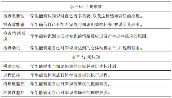 霍恩斯坦四个领域三个层级的深度学习与马扎诺四个水平的深度学习不尽相同,但仔细分析其中的具体指向,发现有不少相似之处。如果以霍恩斯坦行为领域为参照,“适应”的目标是“学生能够在一定程度上熟练地运用他们的知识和能力,在与初次接触到的知识、技能和情感相似或不同的真实或模拟的情境中,解决问题”[44],而马扎诺的“分析”“知识应用”两个水平正是以问题解决为旨趣,分类、概括、探究信息、智力程序和心理动作程序等知识,解决具体问题。可以说,“分析”“知识应用”等同于“适应”层级的“运用”“生成”,只是缺少“分析”与“知识应用”中的情感体验。“表现”是指“评价不同情境并采取实际行动,即依据情境分析、求证、评价及整合知识、价值观与信念并开展行动”[45]。这与元认知有许多相似处,“元认知是对不同类型思维的监控、评估和调节,即负责执行监控(executive control)”[46],两者可以归为一个类目与层级。“志向”包括在知识、技能和情感中表现出来的价值观和信念,这些价值观和信念使人变得精通、卓越、完善和成功,并解决复杂的问题或情况,涉及学生获得高层次的实践知识,更高水平的技能、价值观和专业知识,更高水平的敏感性、艺术性、创造性和智慧,进而做出理性的判断和决定。[47]自我思维由态度、信念与情绪等组成,它们之间相互联系,决定动机强度和注意力的大小。具体来说,自我思维决定了是否介入某一个特定的任务,也决定了在完成这个任务时投入多少精力。[48]可以看出,“志向”和“自我系统”都特别强调信念、情绪与价值观在任务决策、知识建构和思维发展中的重要性,要求学生在任务学习中完善这些非认知因素,并利用这些因素更好地完成任务。