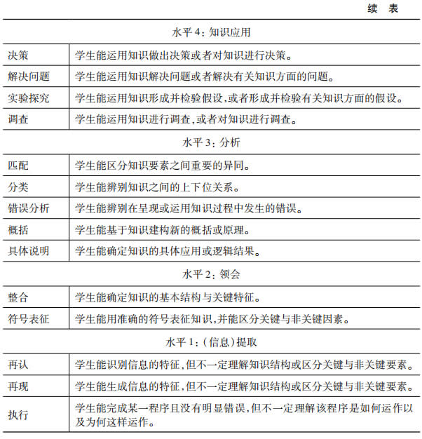 与布卢姆认知目标分类的单一维度和结果取向不同,安德森等人的修订框架包含认知过程和知识两个维度。其中,认知过程包括六个类目:记忆(remember)、理解(understand)、运用(apply)、分析(analyze)、评价(evaluate)和创造(create),这是一个连续统一体,由认知的复杂性决定。也就是说,“理解”比“记忆”的认知程度更复杂,“运用”比“理解”的认知过程更复杂,以此类推。[14]对于每个类目的认知过程,安德森他们建构了一个详细的解释框架:记忆是指“从长时记忆系统中提取相关信息”,如辨认、回忆;理解是指“从口头、书面和图画传播的教学信息中建构意义”,如解释、举例、分类、总结、推论、比较、说明等;运用是指“在一个特定的情境中执行或运用某程序”,如执行与实施;分析是指“把材料分为几个组成部分,并判断各部分之间的关系,以及部分与整体结构或总体目标之间的关系”,如区别、组织、归因;评价是“依据标准或规则做出判断”,如核查、评判;创造是“将要素加以组合,形成一个有机整体,或者形成新的模型或结构”,如提出(假设)、计划、创作。[15]这里的认知过程与布卢姆的行为结果有着显著不同:一是词性发生变化,布卢姆用的是名词,关注行为上的结果变化,而修订版里用的是动词,强调关注习得不同类型知识的思维过程。二是六个层级的表述发生变化,最低层级的知识改为独立的知识维度,新设置“记忆”层级,“理解”替代“领会”,并增加新的内涵,“综合、评价”变成“评价、创造”。三是背后的学习观发生变化,从结果取向的行为表现转向建构的学习观,强调“学生在积极从事有意义的学习时他们知道什么(知识)和他们如何思考其所知(认知过程)”[16]。鉴于此,不能套用布卢姆深度学习层级,而要对上述六个类目的层级进行再分析。
