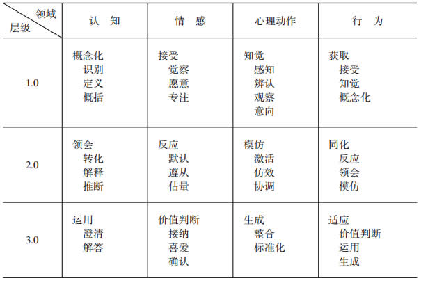 霍恩斯坦不满于布卢姆将认知、情感和心理动作领域各自分开研制教育目标的做法,认为“(三个领域)作为独立的实体,缺乏统一的背景,具有不同数量的类别,分类意图又是不平行的,类别内部和跨类别以及子类别的术语表达也各不相同”,“没有形成一个综合的行为领域促进作为一个完整的人的发展目标”[33],需要有一个综合的分类法,反映认知、情感和心理动作领域目标的组合。为此,霍恩斯坦引入教学的系统观点,基于人的完整性建构了由输入、过程、输出和反馈构成的概念框架。[34]其中,“输入”指信息或内容(他人的或外在的知识),是学生学习一门学科所要掌握的相关内容,具体包括符号性、描述性、处方性和技术性信息。“过程”是指学习者经历的学习体验,体现为落实认知、情感、心理动作等目标,或将它们整合为行为领域目标。“输出”即学习的结果,使学习者成为有知识、有文化和有能力的完整个体。“反馈”是对结果进行监控,确定预期和实际成就水平之间的差异,并对信息(内容)、目标进行调整。在这个框架中,教育目标作为学习过程或体验被重新定义,“认知、情感和心理动作领域可以彼此独立使用,也可以组合成一个行为领域” [35],各自拥有相互关联的五个层次的目标(具体见表1),而布卢姆认知目标分类里的“知识”则被改造成为“输入”中的四类信息或内容。