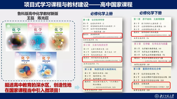 2017年普通高中化学课程标准提出了学科核心素养,我们团队主编了山东科技版高中化学新教材,我们就想项目式学习能不能进入高中。结合高中的特点和现状,我们创意采取了微项目的形式,每一章配一个微项目,这在全国新一轮高中教材中也是独一份的。这套国标教材已经在山东、北京、广东、海南等省的很多地市正式使用,它对高中的项目式教学开展起到非常好的引领作用。我们看到到这两年开展高中化学项目式教学的区域和老师明显增多了。