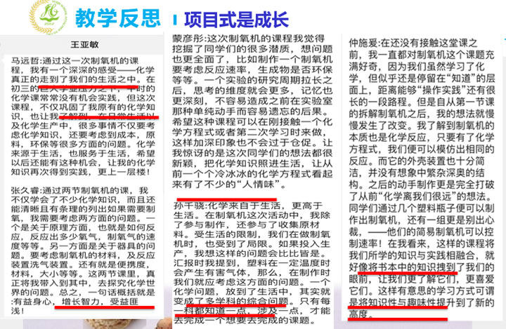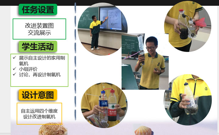 在学生的项目作品展示环节中,每个小组孩子们都展示他们自己做出的制氧机,且现场制出氧气并检验。他们之间还要进行评比、答辩,台下的同学要提问,台上的同学要回答提出的问题,要讲述制作的经历、失败、反思、成功的经验等。