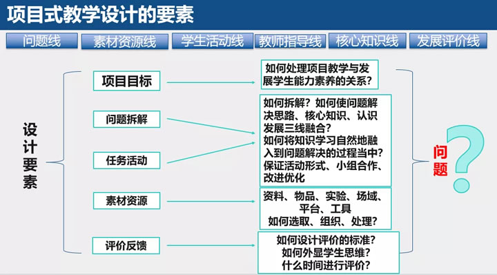 老师在进行项目式教学设计的时候确立这几条线非常重要,分别是问题任务线、素材证据线、学生活动线、教师指导线、核心知识线和发展评价线,也包括设计要素里面要处理好的关键问题。因为有大量的老师们在项目式教学中经历了困惑和失败,不清楚改进以后到底改进了什么、解决了什么问题,这些都是我们基于实践总结出来的一些关键问题。