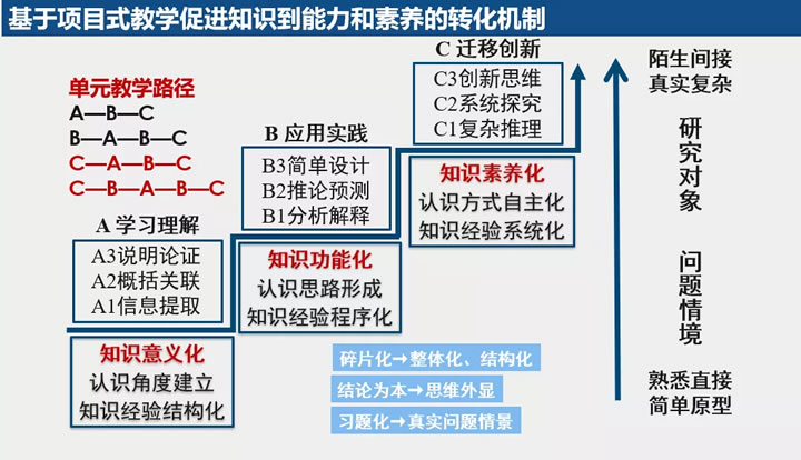 我们常态教学实际上更多在A1、A2水平,很少有高阶的能力任务和情境给孩子,这个时候我们要去转变。常规教学有两种转变途径, 分别为A-B-C和B-A-B-C,就是在常态教学基础之上要增加B和C的教学设计和活动任务,这个比较符合老师们的最近发展区。项目式教学有C-A-B-C、C-B-A-B-C两种大单元整体设计路径,可以给孩子一个综合复杂的真实问题情境和任务,教师带着孩子进行进行由繁到简,由复杂到单一的问题拆解,然后再经历关键知识的建构、模型建构的过程,形成了基本能力和思路方法然后再去解决综合复杂问题。这是我们所理解的项目式教学跟常态教学之间的多途径机制。