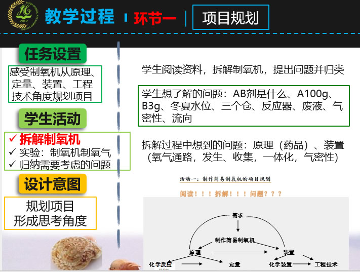 老师将项目任务置于真实的制氧需求背景下,生活中确实需要氧气,也让学生感受到工程师们已经基于化学制氧原理和装置开发出了制氧机,提供了一个具体的商品模型,也提供了真实问题解决的支架。