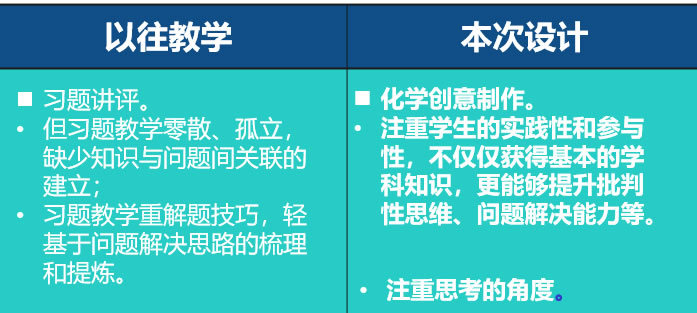 (见PPT)这是授课老师在项目作品展示课,也就是收尾的时候进行的结构性总结和建模。从这个板书上看出这个项目本身承载了化学核心概念的建构,化学大概念的建构,以及工程技术和化学原理的综合,探究与创新实践过程,也包括学生的科学态度和社会责任,因为他们需要根据不同人群的特定需求去设计、优化和改进他们的装置,核心素养融合发展的效果就显现出来了。