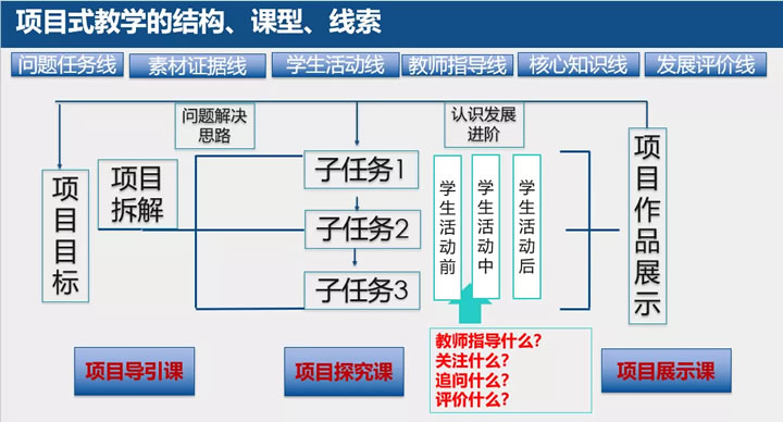 我们总结提出基于学科的项目式教学有它的基本结构、课型和线索(见PPT)。有三种基本课型,第一是项目导引课、第二是项目探究课、第三是项目展示课,这些都是项目学习不可或缺的基本课型,都有它独特的功能。我们今年的项目式教学改进指导已经把一个项目进行分段式的改进研讨,在导引课重点关注教师能不能体现出导引课的特点,完成导引课的功能目标;在探究课看教师能不能抓住探究课的特征和策略;在成果展示课总结应该怎么组织学生展示、互相评价,教师应该怎么点评、总结,我们的指导专家手把手的指导老师进行改进、摸索,这样大大提高了整个项目教学的质量,也是我们今年开展项目式教学改进指导的新进阶。