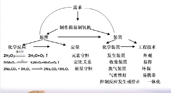 这个时候学生就进入到问题的拆解和规划当中。师生首先要阅读资料,然后提出具体研究问题,并且教师要对同学们提出的问题进行归类。归类以后发现,制作一个制氧机要解决哪些核心问题,选取制氧剂、选取制氧的装置(包括发生和收集的装置),还要解决哪些技术(工程)问题,比如怎么一体化,怎么保证气密性等。