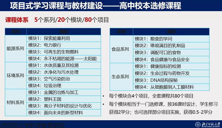 另外一个是高中的校本选修课程,这在目前还是一个空白领域。新课标出来之后校本必修课并没有在全国很好的做起来,那怎么进入这个深水区做项目式教学呢?我们团队的魏锐老师组建了全国各地的老师形成百余人的开发团队进行了两年的艰苦工作,他们采用众筹式的研发模式,边设计、边研究、边出成果。他们设计了5个系列、20个模块,一共80个项目,从化学学科来讲项目式教学覆盖了全学段、全学程。课程现在正在建设当中,我们很期待这批成果。