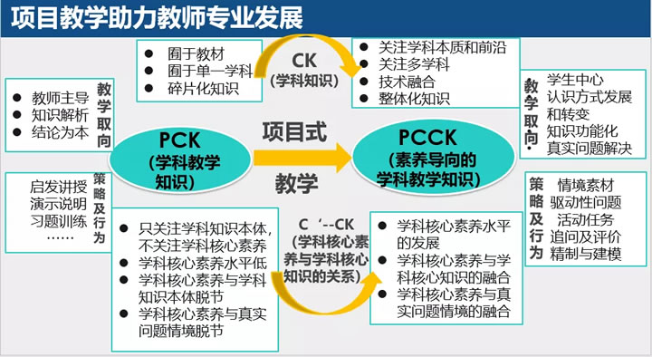 项目式教学可以把老师从PCK的状态变成PCCK的状态,因为教师对于学科知识的认识,从碎片化的学科知识理解,到关注学科本质前沿,关注多学科、关注技术融合,关注整体化知识的理解。老师经过项目式学习以后素养水平更加融合,其教学更加真实,更加关注问题解决和学科知识的融合。