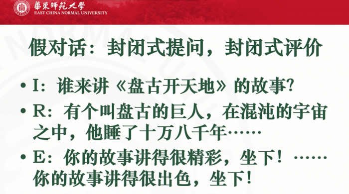 或者是半封闭式的提问,比如说一个老师问:“谁来讲盘古开天地的故事?”这就是一个半封闭的,因为只允许讲这个,不允许讲别的。有一个学生就开始讲,然后老师说讲的不错,请坐。讲得很不错,请坐。这都是封闭式的,尽量鼓励老师减少这样的模式。