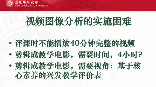 可是到了教学研究的时候遇到很多困难,遇到什么样的困难呢?各位看一下,第一个是你评课时不能把录了40分钟的录像重新放一遍,这是不可以的,因为老师没有这个时间。你重新放一遍也没有太大意思,所以你要剪辑成为短电影,短到什么程度,采用国际上比较通行的方式,比如说5分钟。