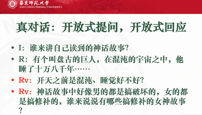 做一个变化怎么变呢?这是我们提倡的对话,开放式的提问,开放式的回应。比如说谁来讲讲自己读到的神话故事?有一个学生说有个叫盘古的巨人,我读到了盘古开天的故事。另外一个学生说我读的是女娲补天的神话,老师就回应,老师就会说那开天之前是混沌的、是睡觉的,你有什么想法?他只是一个跟进的,不是封闭的。比如说老师会说那神话故事中好像男的都是搞破坏的,女的都是搞修补的,谁来说说有哪些搞修补的女神故事?还有什么比如说嫦娥奔月,还有什么什么,可以举很多这样的女的神话在里面她是个怎样的形象,就会有一个开放的状态,打开了,不会把它关住。