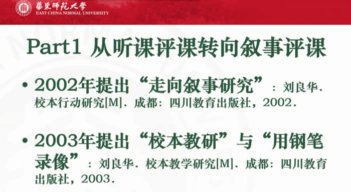 我是关注教学改革的,我在硕士的时候就有一个理想,希望能够把中国近一百年以来的教学改革和教学实验有影响的都要挨个研究一遍,大体上也实现了我的理想。到了博士期间,我就开始做了一件事,关注行动研究。我的博士学位研究论文叫《行动研究的史与思》,其实就是行动研究的历史与思考,后来2002年出版了《校本行动研究》,就正式提出来走向叙事研究,主要是受华东师范大学丁刚教授的影响,因为当时大家都在关注叙事研究。2003年其实是2002年底,我、崔允漷教授、吴刚平教授就一起从上海出发到江苏昆山参加教育部主持召开的建立校本研究制度这么一个会议。2003年全面开始铺开校本教研了,我就出了一本书叫《校本教学研究》,这是我的学术的起点。这两本书一直决定了我今天的学术感觉、学术方向、学术形式。