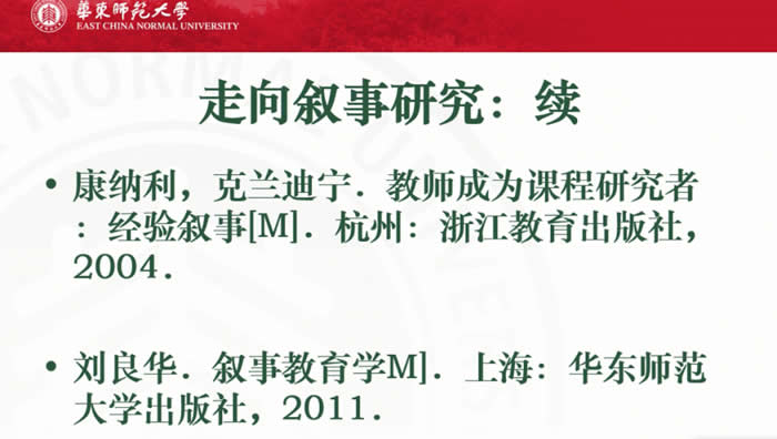在《校本教学研究》里面我们提倡叙事评课,当时围绕这两个主题我发表了大量的文章,几乎所有的文章都围绕两个关键词,校本教研和叙事研究。后来也翻译了一本书就是康纳利作者他这本书在叙事研究领域也比较有影响。后来我本人也出了一本书《叙事教与学》,算是我对叙事研究做了一个小结了,从那以后我一直做叙事研究,但是很少写叙事研究的书,这是当年翻译的这本书。