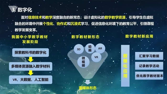 这种数字化以教材为例,可以清楚地看到原来的纸质教材无法跳跃式、快捷式的搜索等等,但是今天的数字化教材可以把多媒体融入学生的学习包,可以把学生的学习痕迹、学习过程有效地记录在案,从而分析他们的学习逻辑,帮助我们不断优化教学。