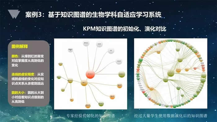 专家一开始构建了初始化的知识图谱:我认为学好遗传学要具备什么样的基础。经过大量学生的在线学习和有效积累、不断演化,就形成了右边的这个图。经过大家的积累以后,这个知识图谱链更为复杂。