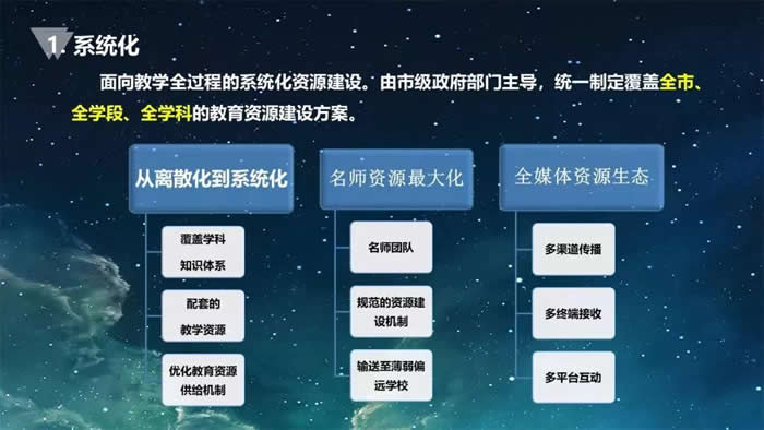 这个“系统性”表现在几个方面:(1)全学段覆盖。(2)全学科覆盖。(3)全人群覆盖。这是从资源的样态和覆盖面来说的。
