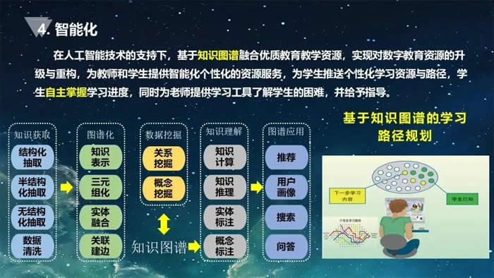 为什么要强调数字化资源具有典型的智能化特点呢?因为我们都知道,我们依托知识图谱。知识图谱可以有几种来源。一种是专家结构。比如,物理老师认为学生要学会某一个知识需要具备哪些知识支撑,这是老师认可的知识图谱。但是这样的一个知识图谱,它不一定是学生认知事物的正常规律。
