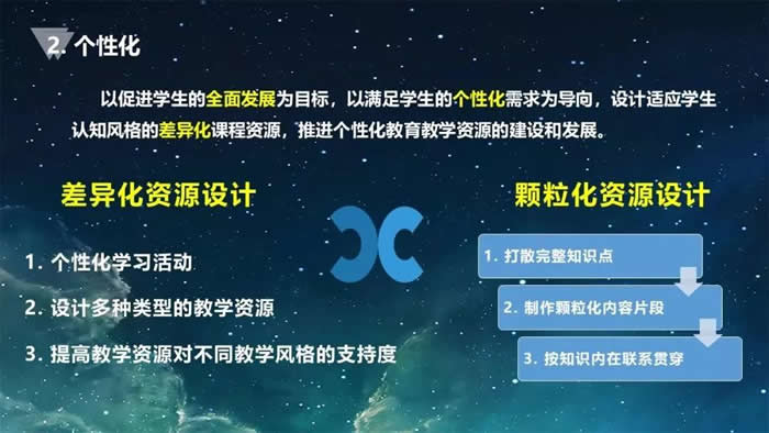 为什么要呈现颗粒化的资源设计?颗粒化的资源设计是为老师考虑的,也是为学生考虑的。每位老师的教学风格不同,每位老师的优点、缺点不同。通过颗粒化的这样一种资源提供,打散知识点,使其变得更加细碎,使得老师设计属于自己的个性化资源。