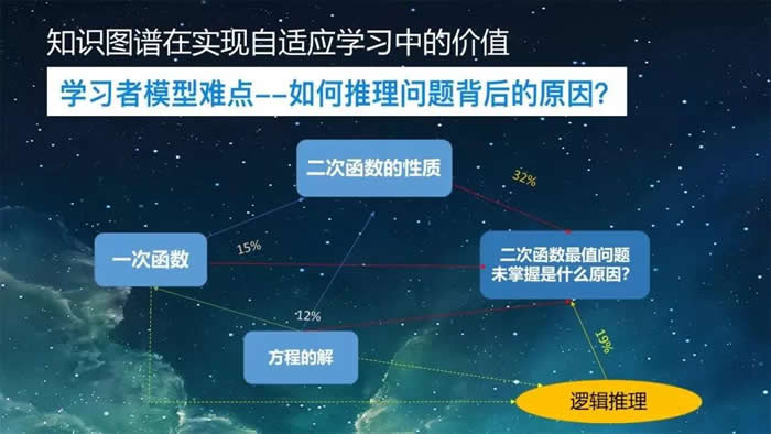 这里我们举个例子,我们认为一次函数是二次函数学习的基础。而这里面要解决的问题是二次函数最值问题,到底没有掌握的原因是什么?是一次函数没掌握、还是二次函数没有掌握,还是解方程没到位?经过学生反复在线操作,就可以建立起学生的学习模型。