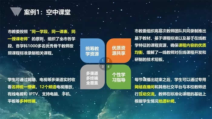 我们借助网络、借助电视进行有效的分发,同时我们每一所学校的老师又能了解自己学生的情况,在集体看完市级资源以后,本校老师通过互动的方式支撑起学生的学习。