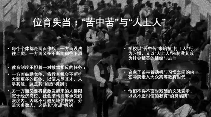在这对既“加热”又“冷却”的拉力下,农家子弟是如何既被激发又被挫败?毛坦厂中学可谓“高考工厂”的典范,考分是硬道理,提高考分的唯一秘诀就是时间加汗水,题海战术,重复训练,每天学习时间长达16小时,可谓“血汗学校”。被称为“血汗工厂”的富士康,工人在8小时工作外再加班3、4个小时,血汗学校与血汗工厂是同构的,学校需要培养现代生产流水线所需要的人力与人性:让他们能持久地、不停息地运转,惜时如金,严格自律,相互监督且竞争。他们坚信“吃得苦中苦,方为人上人”,这里有两重悖论,其一,学校以“苦中苦”来培植“打工人”行为惯习,又以“人上人”来刺激成为社会精英的情绪与志向;其二,农家子弟带着动机与惯习之间的内在冲突——走入大众高等教育时代,他们不得不面对残酷的文凭竞争,以及不愿相信的教育“消费陷阱”。