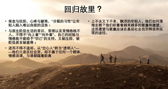 依恋与抗拒、心疼与鄙夷,“分裂的习性”让年轻人陷入难以自拔的沮丧:与原生阶层生活的常识、常理以及常情格格不入,不得不“向上看”、“向外看”,自己的经验与情感既不给予“切己”的支持,同时被压抑、被贬低甚至被羞辱:这个脆弱的年轻人,在不属于自己的水域,或笨拙地模仿、或格格不入;进而退却,从“空心人”转为“透明人”——他只是在社会里,却不属于任何一个群体,不归属任何一个价值群体。情感淡漠,与谁都隔着距离。能来一趟回归之旅吗?