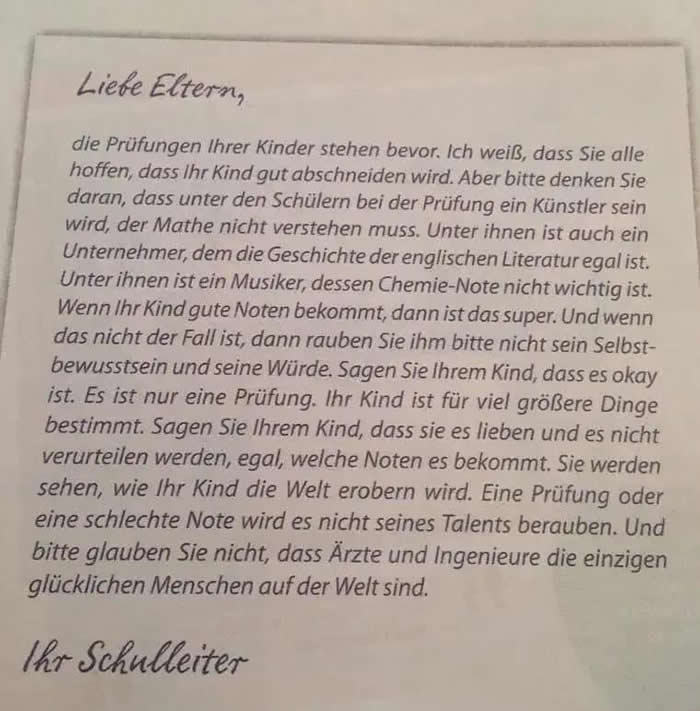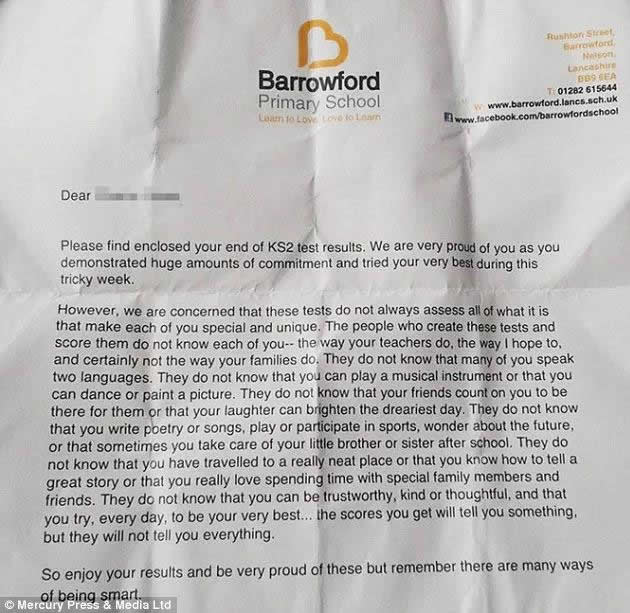 这封校长给家长的信,就对之进行了有意义的提醒和引导。要求家长认识到,孩子现在的考试成绩并不能决定他们未来的发展和成功。“请记住,这些参加考试的孩子中,将来会有一位不需要懂数学的艺术家,一位不用关心英国文学史的企业家,一位不用纠结化学成绩的音乐家。”