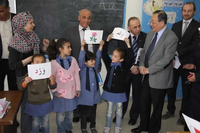 访问约旦的巴勒斯坦难民子弟学校,与教师和学生在一起