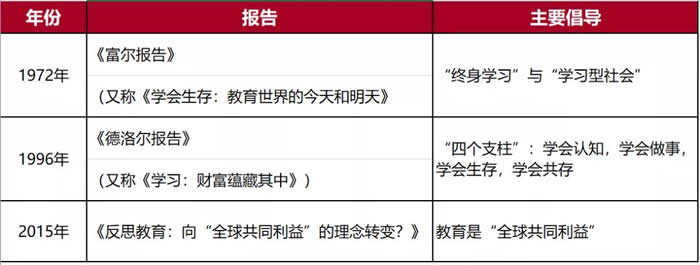 谈到教育的全球治理,它有几个维度。第一,分析全球教育的发展趋势,提出新的教育理念,从而引领全球教育发展方向;第二,为世界各国的教育发展制定规则和标准;第三,要为全球的教育发展设立目标,如全民教育(EFA,1990年)、千年发展目标2&3(MDG2 & 3,2000年)以及这次的可持续发展目标4(SDG4,2015年),同时还要监测各国实现目标的进程;第四,就是促进双边和多边的国际教育合作交流,向发展中国家提供智力和资金支持。实际这也是联合国教科文组织(UNESCO)最基本的功能。自1972年至今,教科文组织发布了多份报告,通过以下这个表格可以看到历年所提到的教育理念: