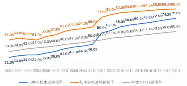 在快速城市化的一个进程当中,农村教育和农村学校的空间都发生了巨大的问题。简单地讲,也就是“城挤乡空”。义务教育不断的让学生大量地集中到县城和城市。到2019年的时候,城镇常住人口率是60.6%,但是小学生在校生城镇化率是75.8%,初中生的城镇化率86.5%。也就是说,小学生和初中生的城镇化远远超过了常住人口的城镇化率。