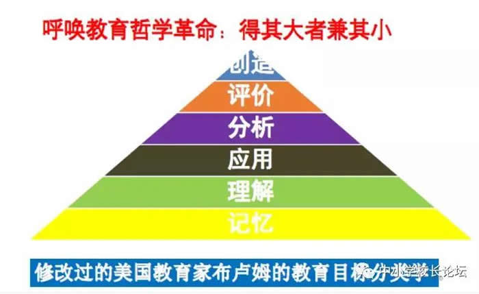 人生下来是无知的,但并不愚蠢。愚蠢是后天的教育造成的。长期以来,我们推行的寻找标准答案的封闭教育,实质是扼杀了儿童好奇和创造性的教育。几十年来,我国教育事业发展很快,无论是教师队伍建设,还是校舍建设、设施设备,都发生了历史性变化,但是,而我们的教育基本上还是讲练模式,讲授和练习占据了教育的绝大部分空间,这样的育人方式不变革难言高质量的教育。著名地理教师王晶华是国家留学基金委第一批派到美国和英国学习的高中教师之一,她在美国学习了半年,听了美国中小学400多堂课。有一堂名为《大事年表:美国动荡的60年代》的历史课,美国人是这样上的:教师让学生先在计算机教室里用两节课做准备,然后要求两个学生一组在课堂上尽量用富有创意的方式展示、交流、讨论自己的研究成果。王晶华老师感叹道:这样的学历史真不简单!原来死记硬背是一种多么懒惰而粗放的教学方式!这样的作业不仅培养了学生查阅资料、收集信息、自主探究等学习能力,而且学生的独立思索、批判性思维、创造性思维的能力也潜移默化地培养了起来。这样获取的知识,学生自然能深刻理解,对知识的掌握也是最牢固的。现在,我们的教育基本上局限在低阶学习,即记忆、理解、简单应用的层次,很难达到分析、评价、创造的层次。而美国的教育是倒过来的,他们追求让学生在综合学习活动中通过自主构建完成思维训练和知识的掌握。儿童的学习不是被动接受知识,而是主动发现和建构知识,不是机械地从低阶学习走向高阶学习的,而是在综合的主动的探究的学习过程中,在思维训练中同时完成知识建构的。我们呼唤教育哲学的革命:得其大者方可兼其小!