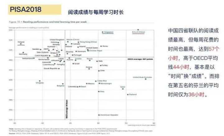 2018年关于阅读成绩和学习时长的调查当中,中国学生的学习时间之长,同样都已经是高于OECD国家的平均值。