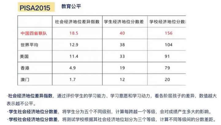 具体而言,中国在教育公平方面的表现究竟是什么样的呢?在2015年的测试当中,它主要提供了三组指标:一是社会经济地位的差异指数,评价学生的学习能力、学习意愿和学习动力,来看各个阶层孩子的差距;二是学生社会经济地位的分数差,把学生分成五个不同的等级,计算每跨越一个等级对成绩分数产生的影响;三是学校经济地位的分数差,把学生分为三个等级,测量不同学校之间等级的分数差。结果显示,中国三个教育公平的指标都高于世界平均值,也高于美国。中国香港、澳门的教育公平状态是远远好于上海、北京、浙江、广东的。