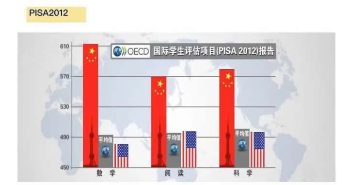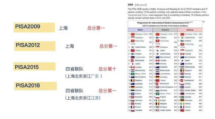 中国从2009年开始参与了OECD的PISA测试,给我们提供了一个非常完整、非常系统、非常权威的第三方教育评价,帮助我们来认知中国基础教育的现实。这个PISA测试是面对15岁青少年的学科测试,主要是数学、科学和阅读三个方向,我们所熟知的就是这么一个成就,就是中国从2009年首次参加PISA测试开始一举夺冠,取代了多年来被称为世界第一的芬兰教育。