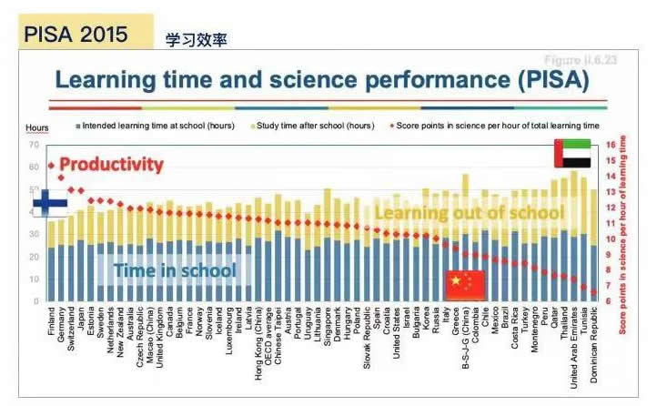 关于学习效率的评价,中国在测试的国家中位于靠后的梯队,而芬兰和日本都是在最前的序列中。这证明了我们的学习时间虽然很长,但是学习效率很低。