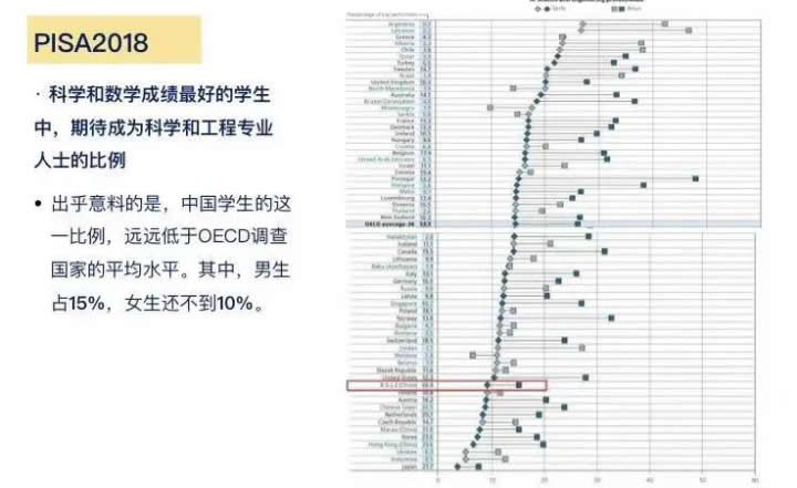 PISA测试还提供了一些很有意思的评价,这就是在科学和数学成绩最好的学生当中,期待成为科学和工程专业人士的比例,出乎意料的是中国学生的比例远低于OECD国家的平均水平,男生占15%,女生不到10%。还有一个调查是关于当教师的意愿,同样是非常非常低的。