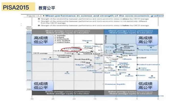 PISA测试它不仅提供了学业成就的评价,而且也提供了关于教育公平的评价。在2015年评价当中,它把学业成就和学校的公平区分了四个领域,中国是处于高成就、低公平的区域。而芬兰、日本、德国这些国家都是处于高成就、高公平的区域。显然、高成就、高公平是教育的理想,是更值得我们追求的。